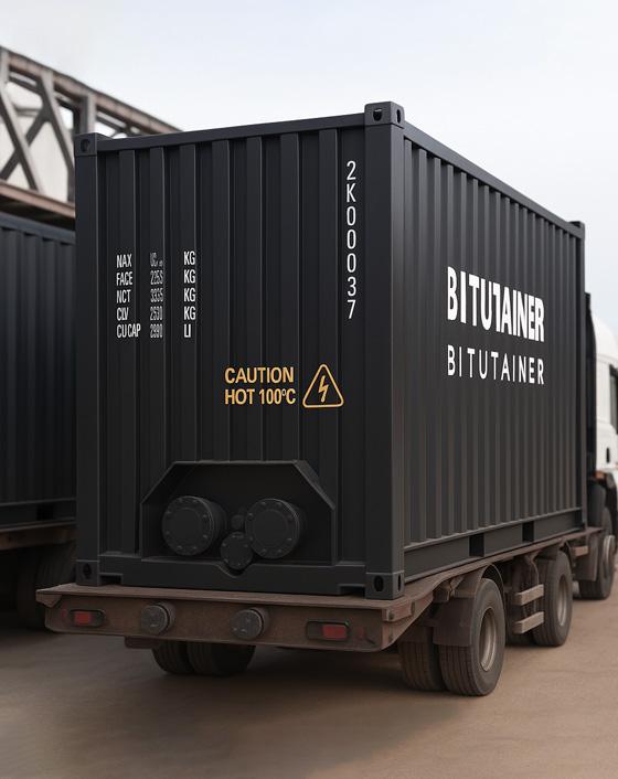 Each Bitutainer unit is built from reinforced steel and equipped with thermal insulation and integrated heating coils or elements, allowing the bitumen to be reheated safely to its working temperature.